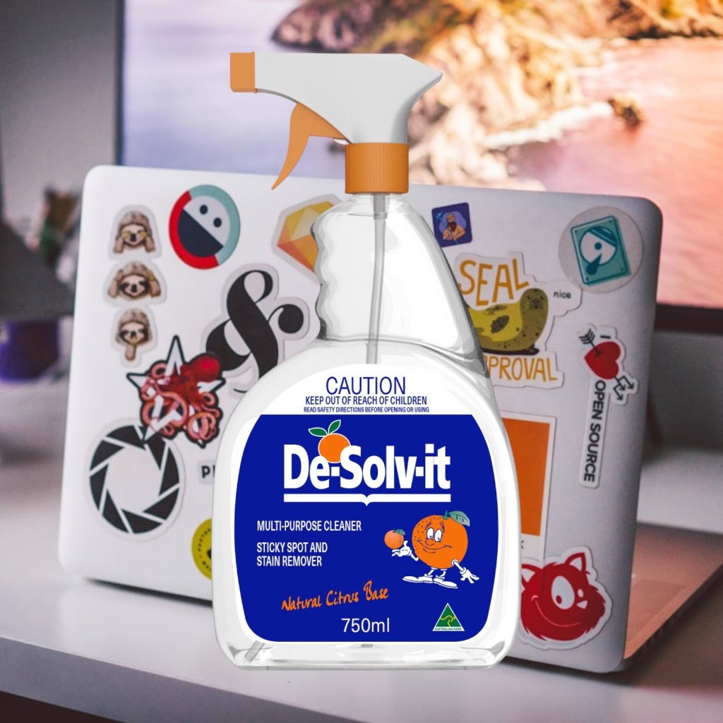 Tape residue and labels: Spray onto surface, leave one minute, wipe clean.