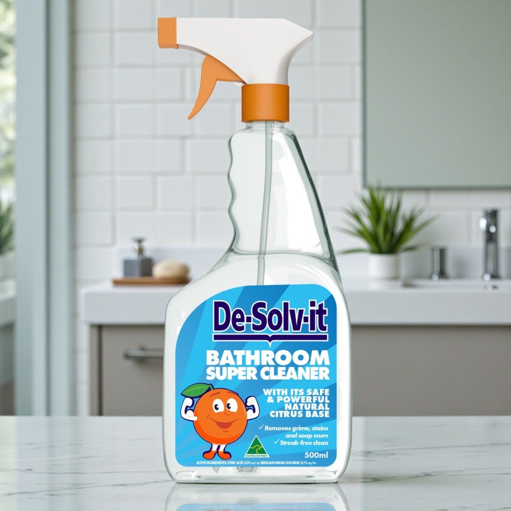Cuts through soap scum, grime and bathroom stains. Kills 99.9% bacteria and mould spores. Special film coating prevents water scale buildup for a streak-free finish. Rinse-free. Suitable for glass, tiles, shower screens, baths and basins, taps and chrome, and floors. Do not use on marble, slate, terrazzo, aluminium, granite, or unsealed surfaces.